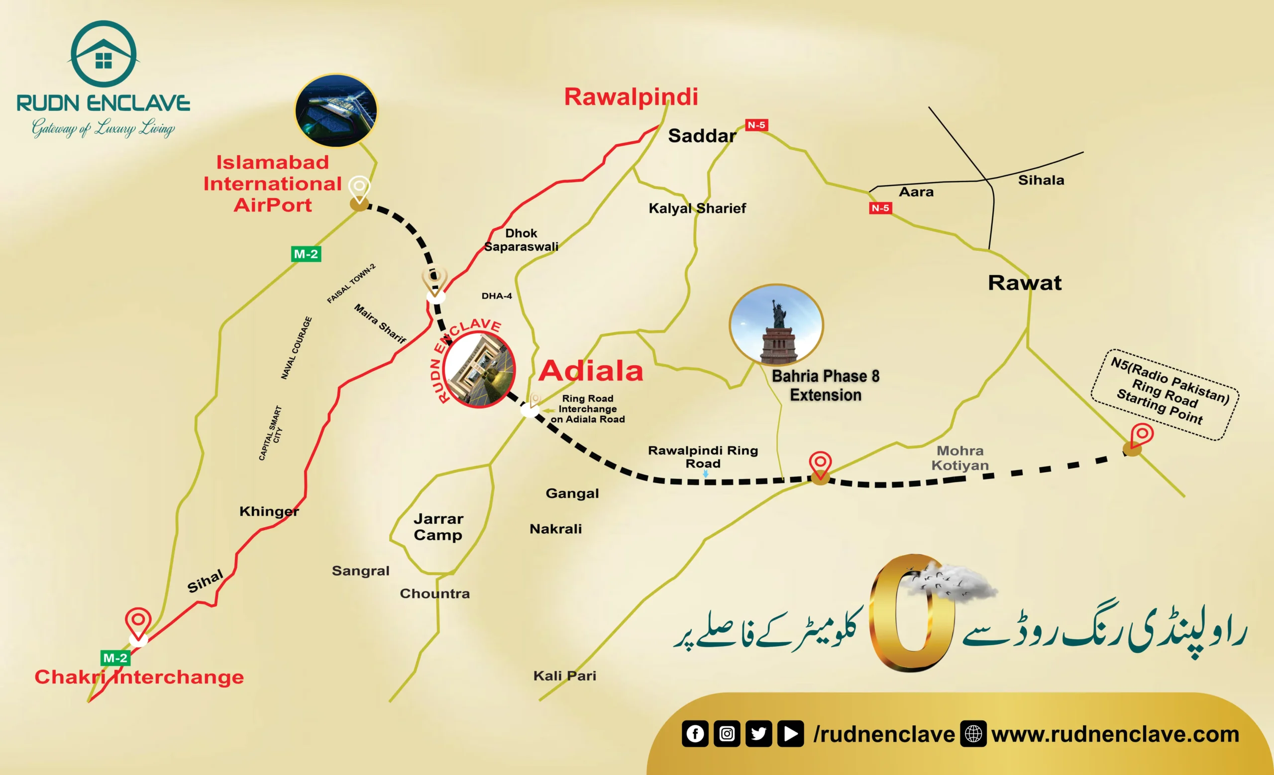 Strategic Location of RUDN Enclave RUDN Enclave is strategically located on Adyala Road in Rawalpindi, offering exceptional accessibility to